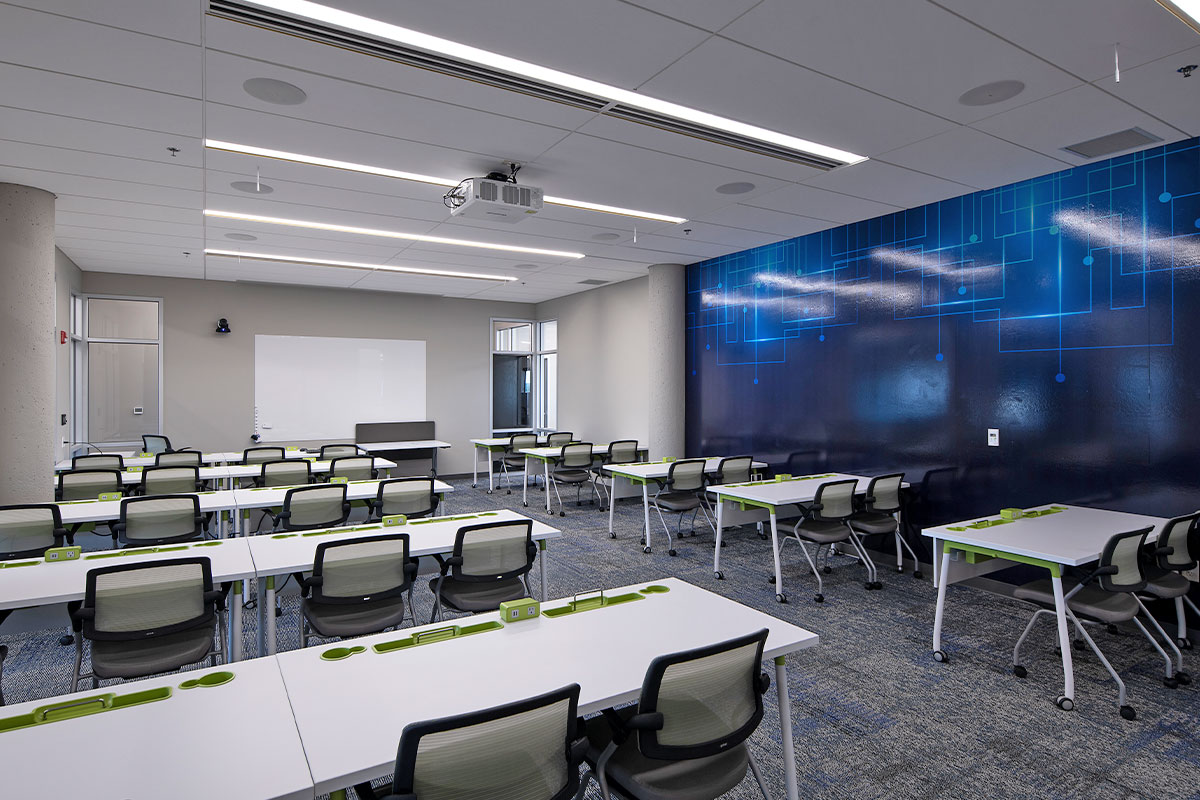 Remodel of an existing 10,000 SF space at Envision’s headquarters building for the Workforce Innovation Center. The Center is dedicated to technical-field employment training for the vision impaired and includes a call center, education center, and experiential training center. The space also includes a reception area, conference room and administrative offices. The Center features a neutral, gray interior finish palette with vibrant blue and green accents. Carpet and luxury vinyl tile flooring with metal transition strips provide both durability and tactile variation. Special features include rotating panels with applied graphics at the lobby highlighting the Envision story and a reception wall pattern created by CNC technology. Other low vision aids include low-glare and color changing lighting, interactive smart boards and braille at all graphics and signage.
