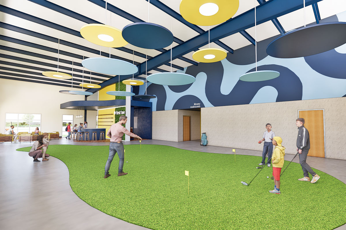 This 6,000 SF facility features four hitting bays, a learning library for homework and tutoring activities, administrative offices, and a staff break room. The lobby opens to a spacious multipurpose room which features a putting green and large, operable overhead doors which allow for plentiful natural lighting, and can be opened as weather allows to extend the space to the outdoors. The room will be available to host community events and mentoring sessions. First Tee is an international non-profit organization.