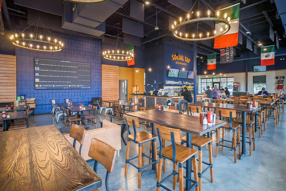 Located in Wichita State University’s Braeburn Square, Social Tap Drinkery is a 5,600 SF social destination designed to bring the community together and foster new connections. The taproom features a central bar, a large keg room, and a workroom with coolers, all set within a contemporary industrial design that includes polished concrete floors, open ceilings, and glass overhead doors. Adjacent to the taproom are two virtual kitchens, with seating for 89 in the taproom and an expansive lakeside patio offering an additional 56 seats for guests to enjoy.